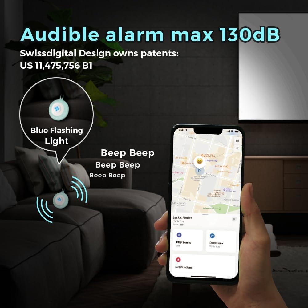 Sound and Light: Play an audible alarm with a volume of up to 130 dB and activate a blue light flash to quickly and easily find your missing items. Swissdigital owns patents. US patents: US 11,475,756 B1.