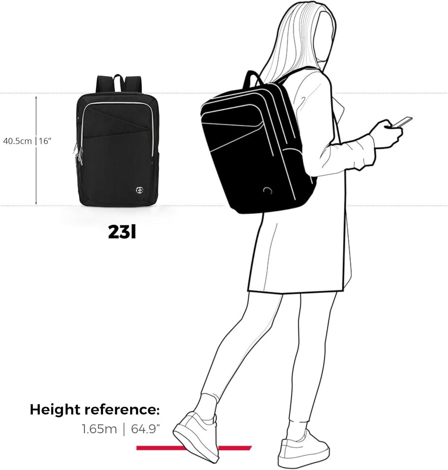 COMMUTER PICKS:This 23l compact business size backpack (1.79lbs, 16”H x 11”W x 7”D) keeps you organized with 4 separate large & several small compartments. Ideal for daily commuters carrying a 15.6” laptop, a tablet, textbooks, 2-3 pcs of clothes, bottle, wallet, keys and powerbank, and other daily essentials, not for overnight load.