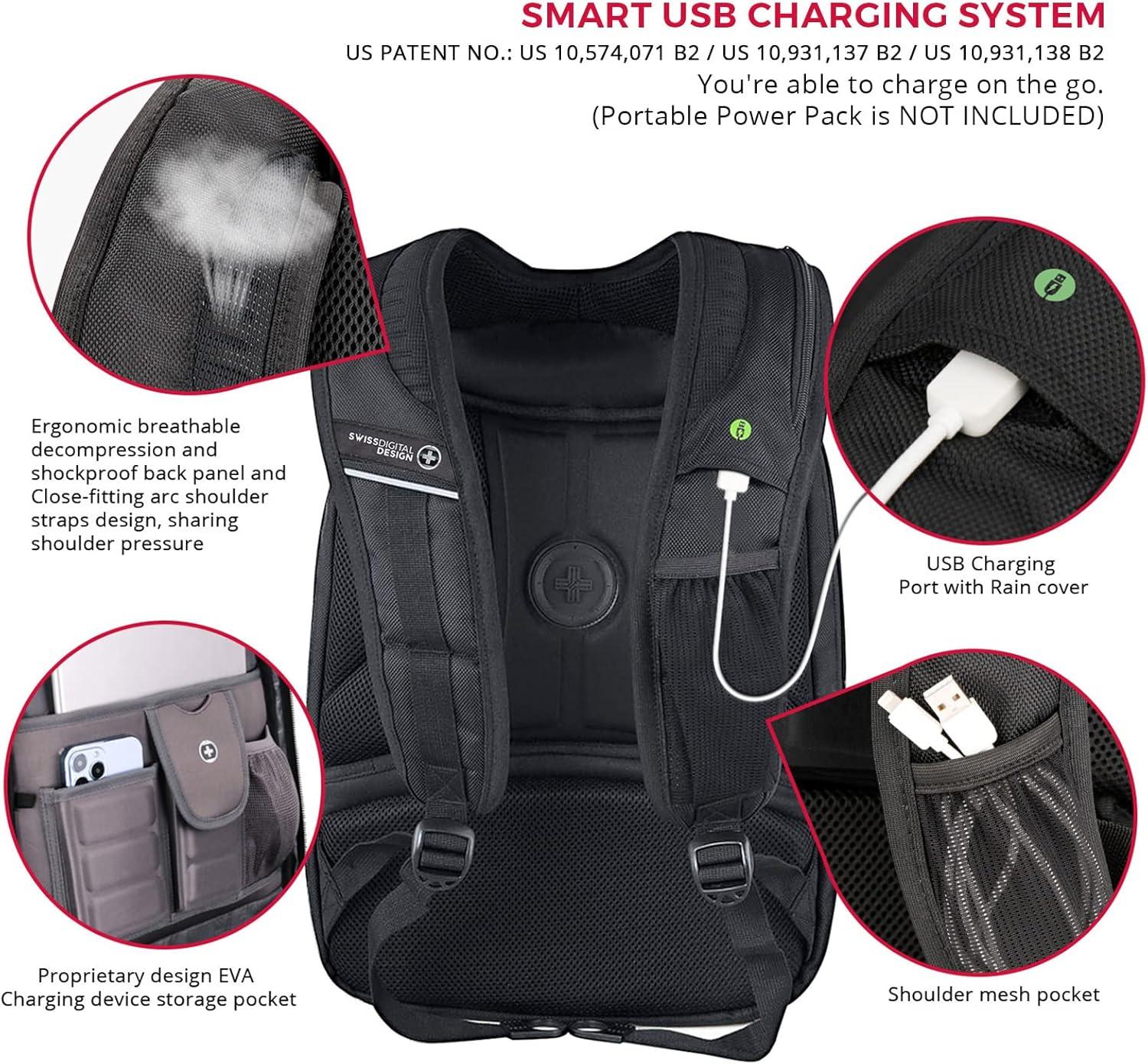 TSA friendly travel backpack unfolds freely to 90-180 degrees when going through security before boarding, allowing quick and efficient passage through airport security. The included USB-C cable is intended for use with a power bank with a USB-C output or with a compatible adapter.